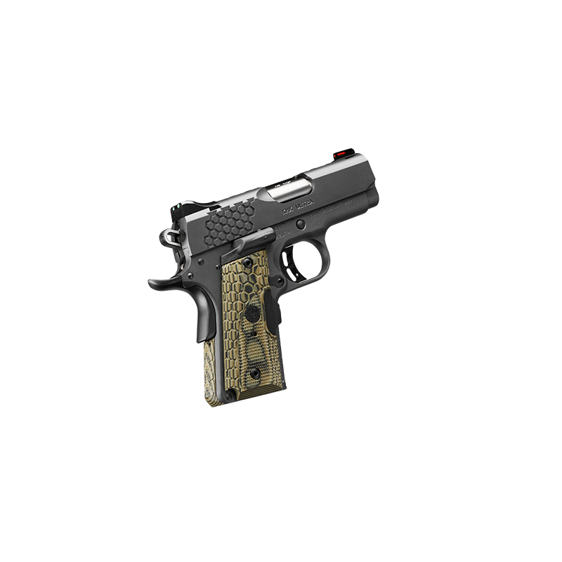 Le KHX Ultra est équipé de plaquettes de crosse Hogue MagGrip G10 améliorées avec laser rouge intégré et une pièce de logement du ressort principal en G10, offrant une prise en main exceptionnelle. Il est également doté de guidons à fibre optique verte et rouge pour une image de visée lumineuse et nette.
